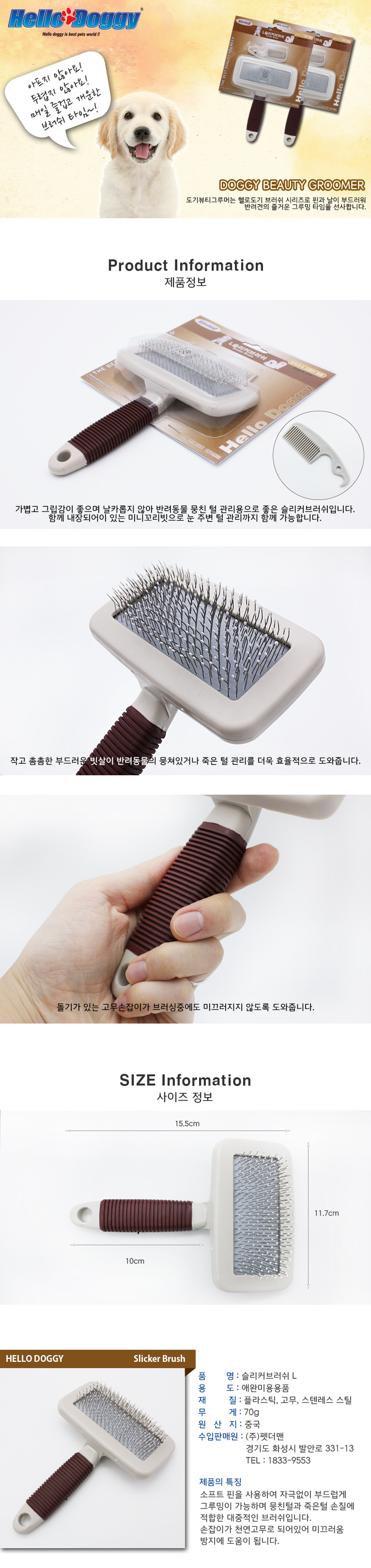 핀과 날이 부드러워 그루밍에 적합하고 심플한 디자인과 첨단공정으로 내구성이 뛰어나며, 소프트핀을 사용하여 부드러우며, 천연고무 손잡이로 미끄러짐을 방지하고, 손잡이 끝부분에 고리를 만들어 보관 및 사용이 용이합니다.