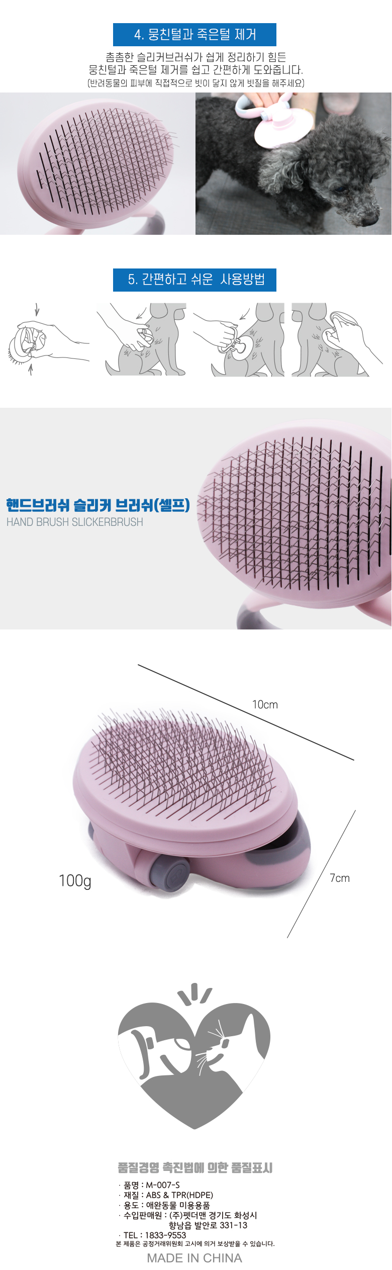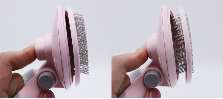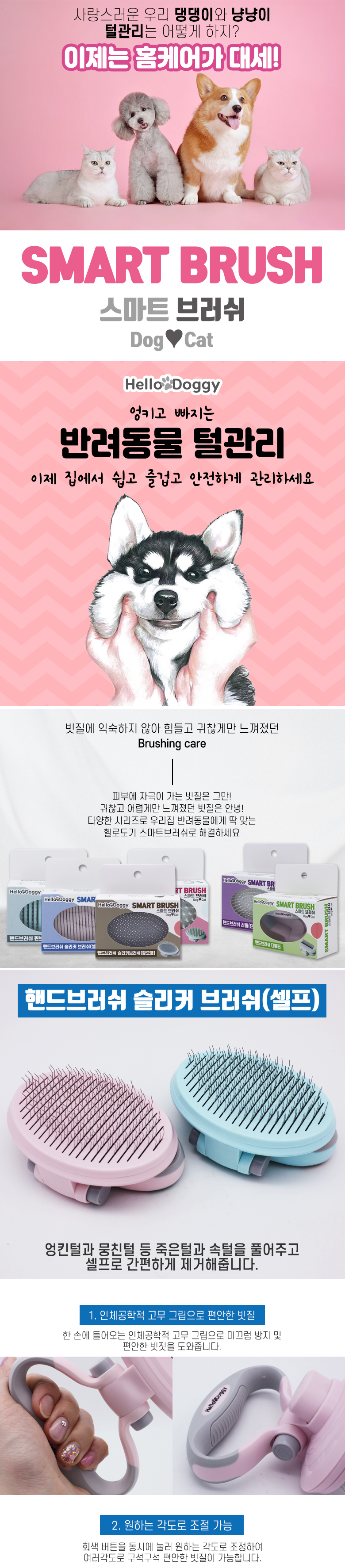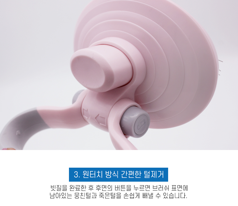 원하는 각도로 조정할 수 있어 여러 각도로 구석구석 빗질이 가능하며, 보관하기도 용이합니다. 엉킨털과 뭉친털 등 죽은털과 속털을 풀어주고 원터치 방식으로 셀프로 간편하게 제거해줍니다.