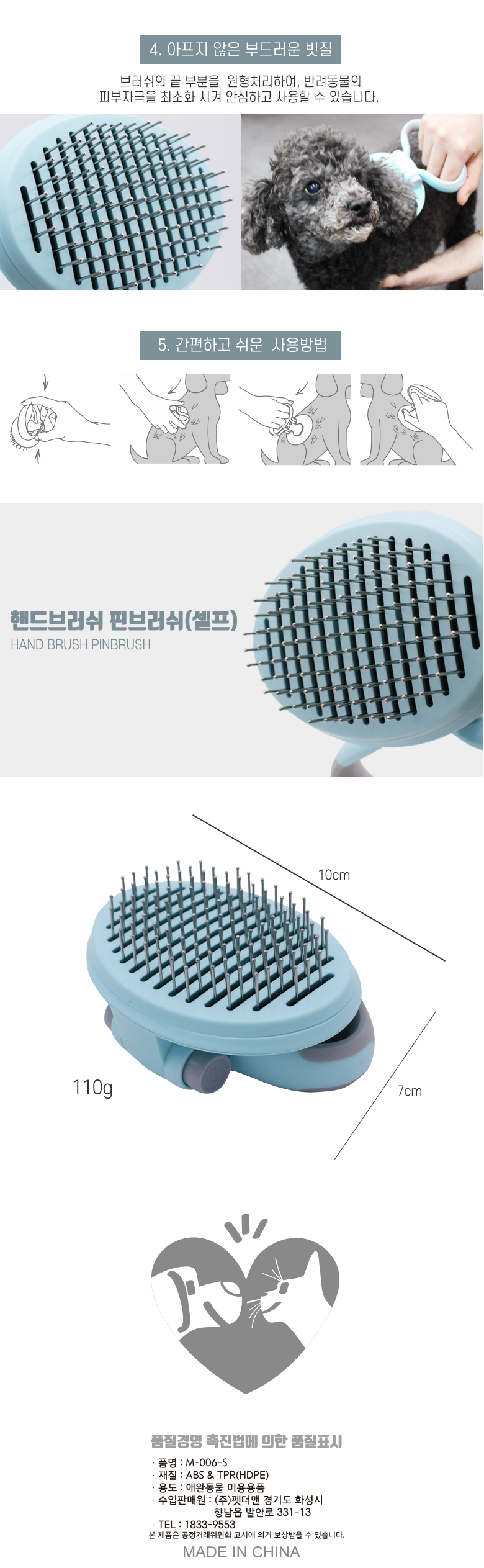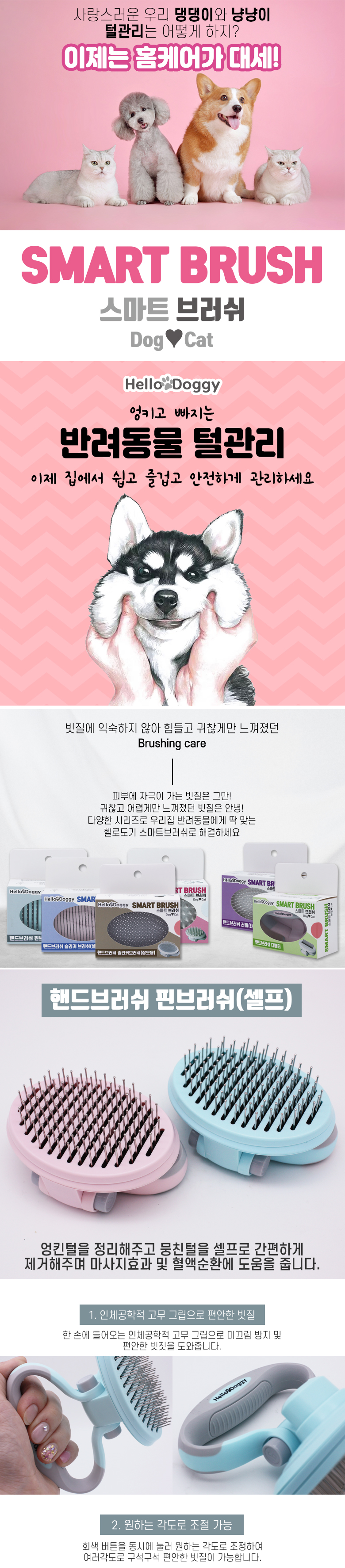 원하는 각도로 조정할 수 있어 여러 각도로 구석구석 빗질이 가능하며, 보관하기도 용이합니다. 엉킨털을 정리해주고 뭉친털을 원터치 방식으로 셀프로 간편하게 제거해주며 마사지효과 및 혈액순환에 도움을 줍니다.