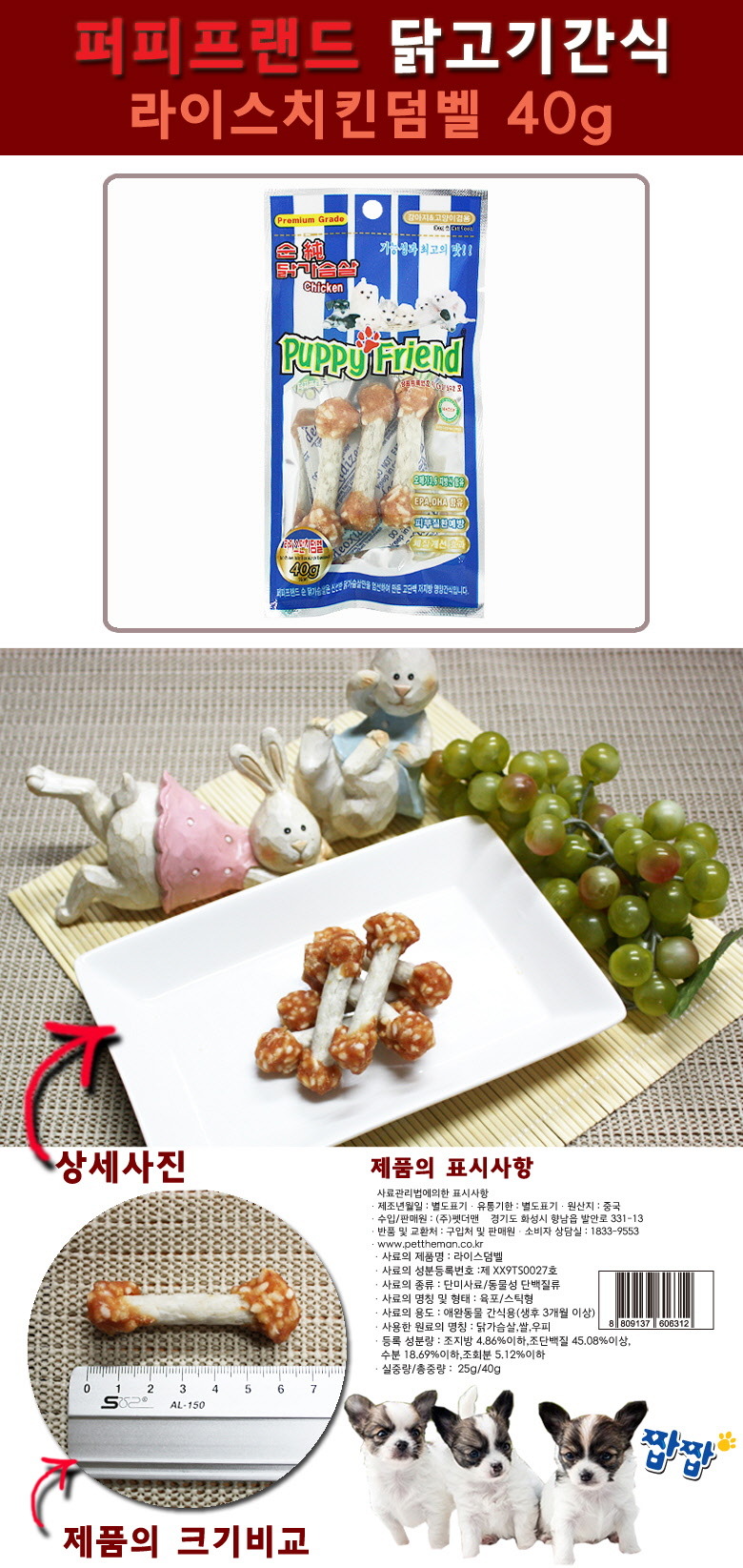 라이스로 만든 먼치스틱에 닭가슴살을 뭉쳐 덤벨처럼 만들어 건조한 간식 입니다.