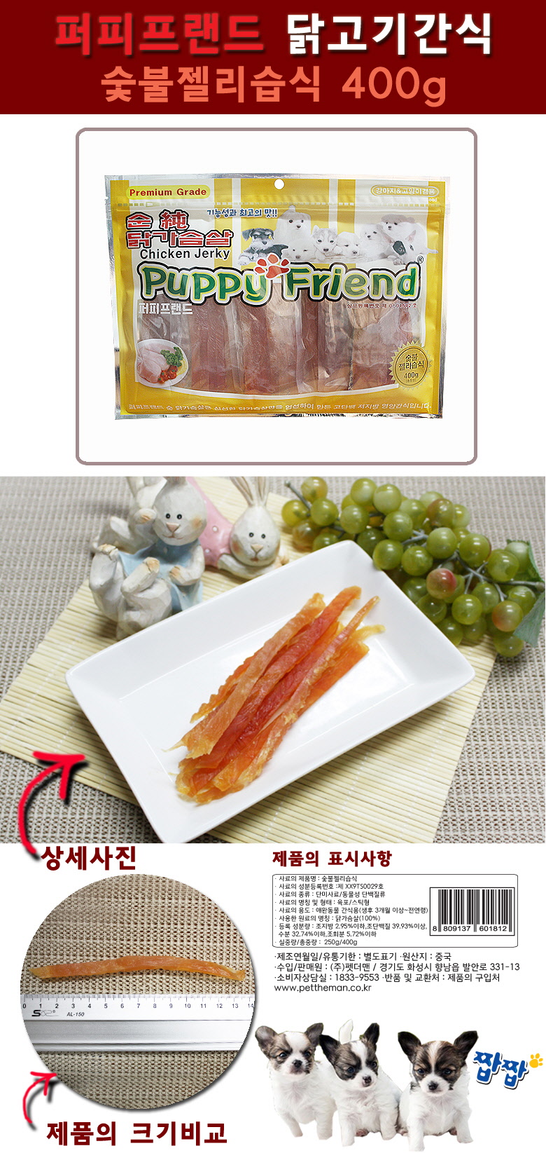 신선한 닭가슴살을 그대로 수분을 높여 건조시켜 부드러운 식감으로 촉촉하게 건조한 간식입니다.