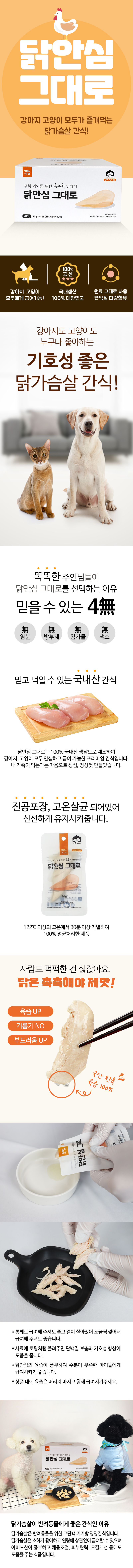 신선한 닭가슴살을 그대로 수분을 높여 건조시켜 부드러운 식감으로 촉촉하게 건조한 간식입니다.