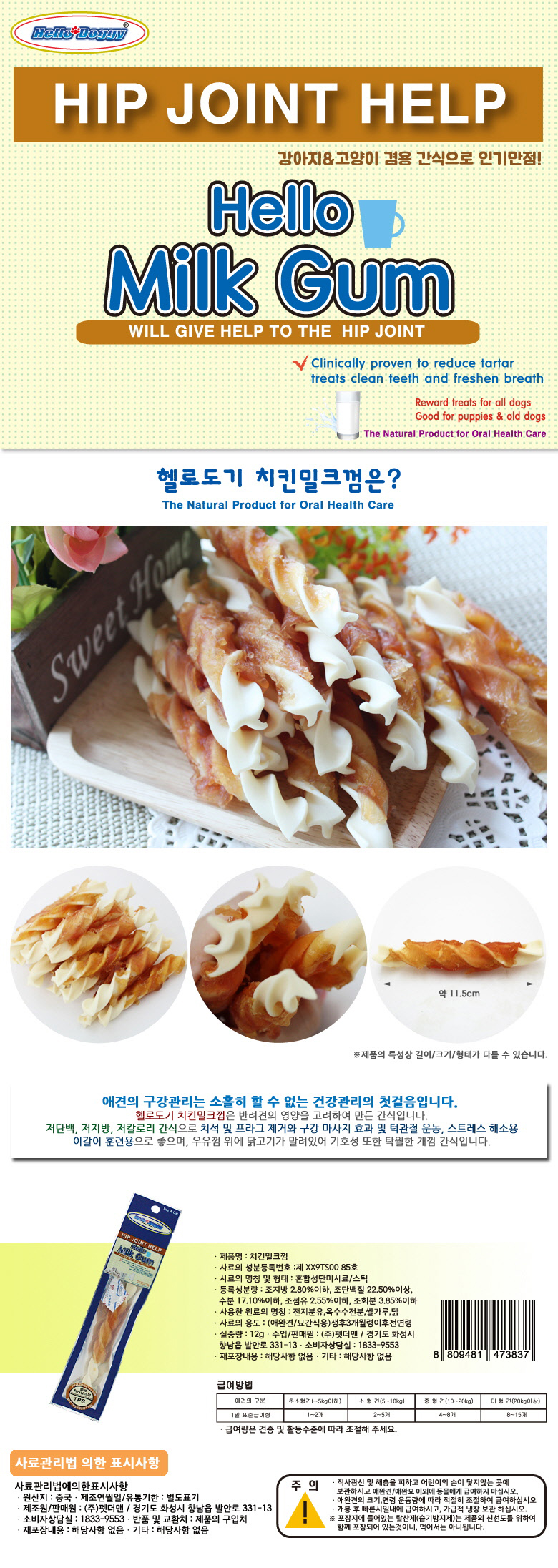 저단백, 저지방, 저칼로리 간식으로 치석 및 프라그 제거와 구강 마사지 효과 및 턱관절 운동, 스트레스 해소용, 이갈이 훈련용으로 좋으며, 밀크껌 위에 닭고기가 말려있어 기호성 또한 탁월한 개껌 간식입니다.